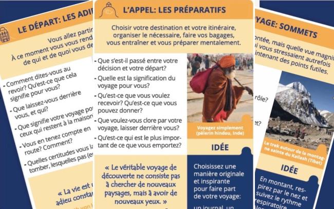 Bienvenue ! Nous vous invitons à nous accompagner sur un pèlerinage en 7 étapes. En voyage, également vers vous-même Vous avez relevé le défi de quitter votre entourage familier et d’entreprendre un pèlerinage. En cours de route, des obstacles et de l’aide vous attendent, ainsi que des rencontres : avec d’autres personnes, avec vous-même et avec l’Autre. Lorsque vous avez atteint votre destination, il est temps de retourner chez vous. C’est là, que vous pourrez partager vos impressions et vos idées. Et c’est là aussi que vous serez confrontés au défi de les incorporer dans votre vie ‘ordinaire’. Cela est le fil conducteur de notre récit 'Voyage d'Importance'. Le récit est inspiré par les histoires des milliers des pèlerins et par les grands récits de voyage et les traditions de sagesse du monde 'entier'. Nous espérons que cela puisse vous aider à faire un voyage d’importance de votre propre pèlerinage. Vous pouvez: lire notre récit en ligne: voir ci-contre (cliquer en bas à droite pour l'ouvrir en plein écran), ou télécharger le récit sous forme d'un document (PDF). Cartes d’inspiration Ces cartes sont comme un compagnon de voyage. Un compagnon qui vous pose des questions, qui permet d'en savoir plus et qui parfois vous met au défi de prendre un autre chemin. Bref: un compagnon de route spirituel. Pendant votre pèlerinage et sur votre chemin de la vie. Les 24 cartes suivent les sept étapes du Voyage d'Importance. Vous pouvez : télécharger gratuitement les cartes et les conseils d'utilisation, ou commander une version imprimée ou l'acheter à notre gîte. Les 24 cartes, en format de poche, sont plastifiés. Poids : 74 grammes. Prix : 5 euros (frais de poste exclus). Image Cartes d'inspiration